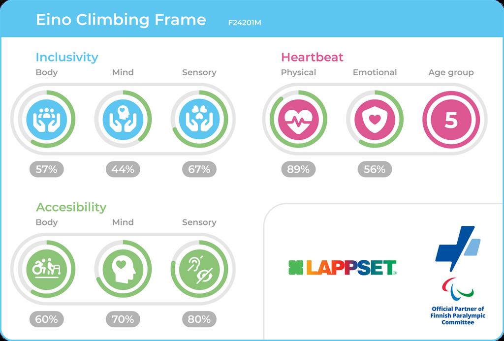 Eino ronimisraam lisab mängule liikumise ja väljakutsete kihte, kasutades köisi, redeleid ja platvorme, mis innustavad lapsi loovalt avastama. Lastele alates 3. eluaastast loodud Eino arendab kerelihaseid, tasakaalu ja osavust, kutsudes lapsi eesmärgipäraselt liikuma. Lapsed saavad ronida, liikuda eri tasanditel ja lahendada probleeme, mis teeb sellest suurepärase valiku koolihoovidesse, avalikesse parkidesse ja kogukonnamängualadele.