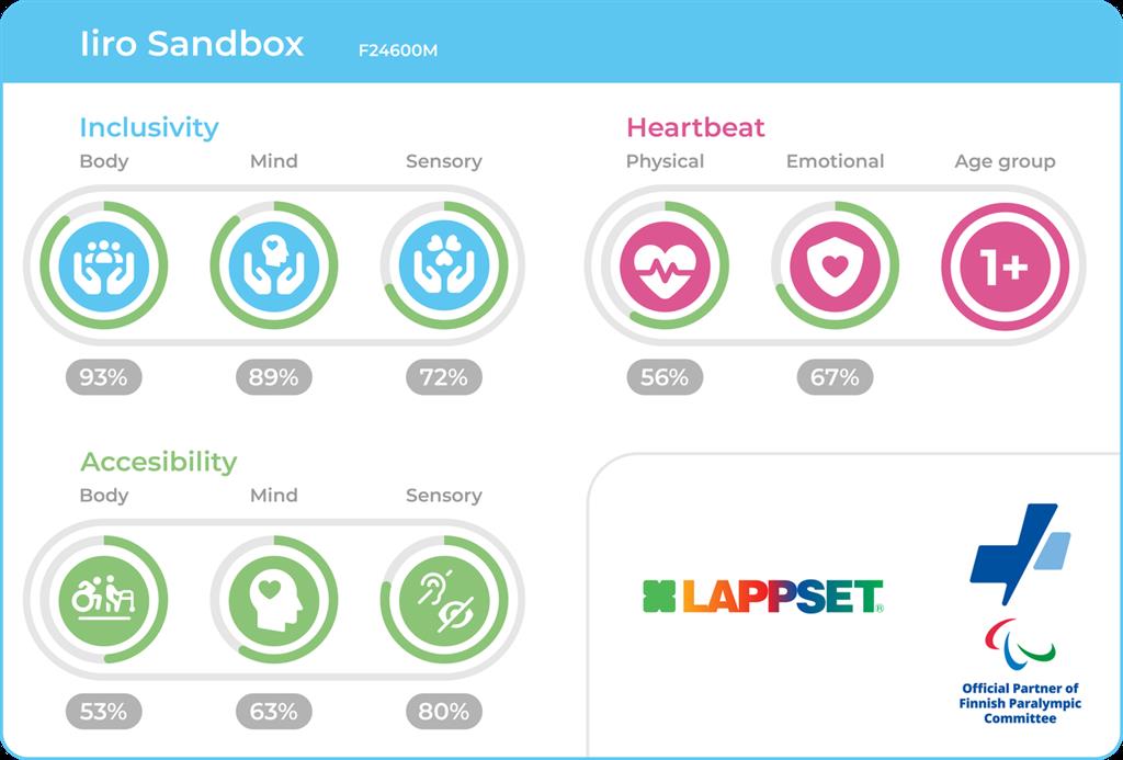 Iiro liivakast pakub kompaktset sensoorset mängukogemust selgejoonelise ja ligipääsetava disainiga. Lapsed (alates 1. eluaastast) saavad koos kaevata, vormida ja ehitada, arendades peenmotoorikat ja sotsiaalset enesekindlust rahulikus ja kaasavas keskkonnas.