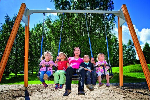 Fantastiskas šūpoles, kurās vienlaicīgi var sēdēt un šūpoties līdz 5 cilvēkiem - 3 vietas uz vidējā rāmja un 2 mazi bērni sānos bērnu sēdeklīšos.